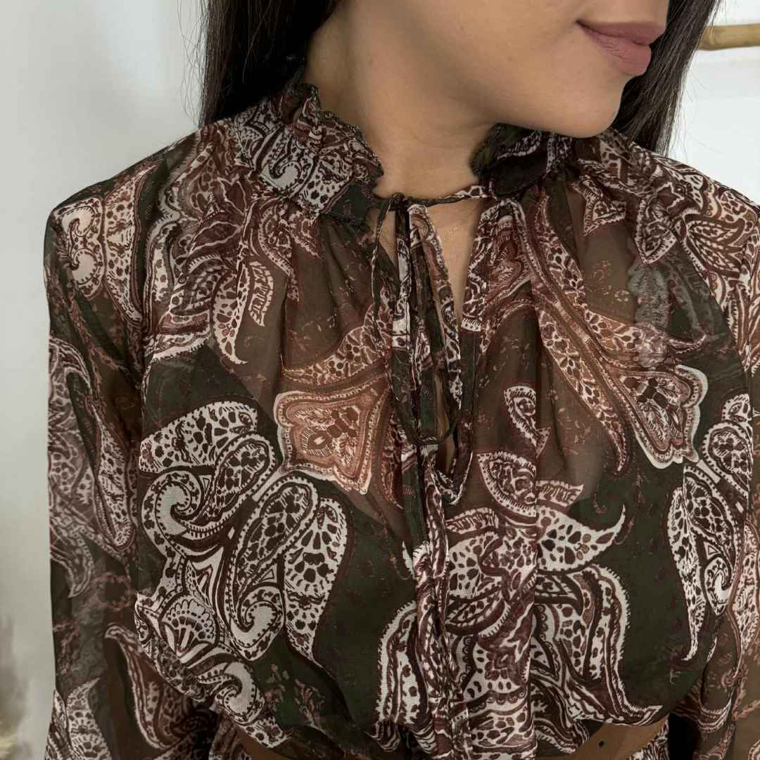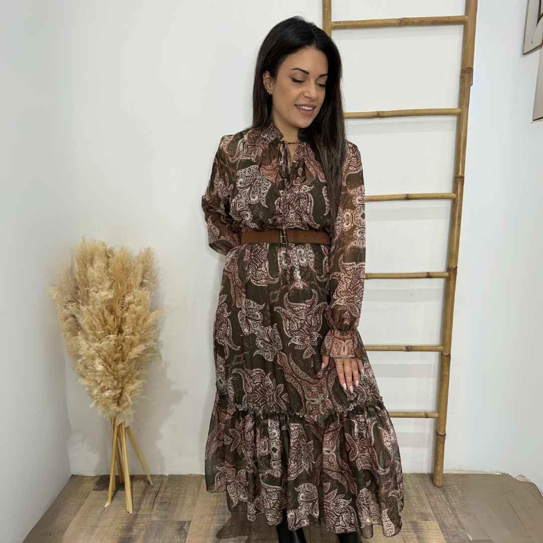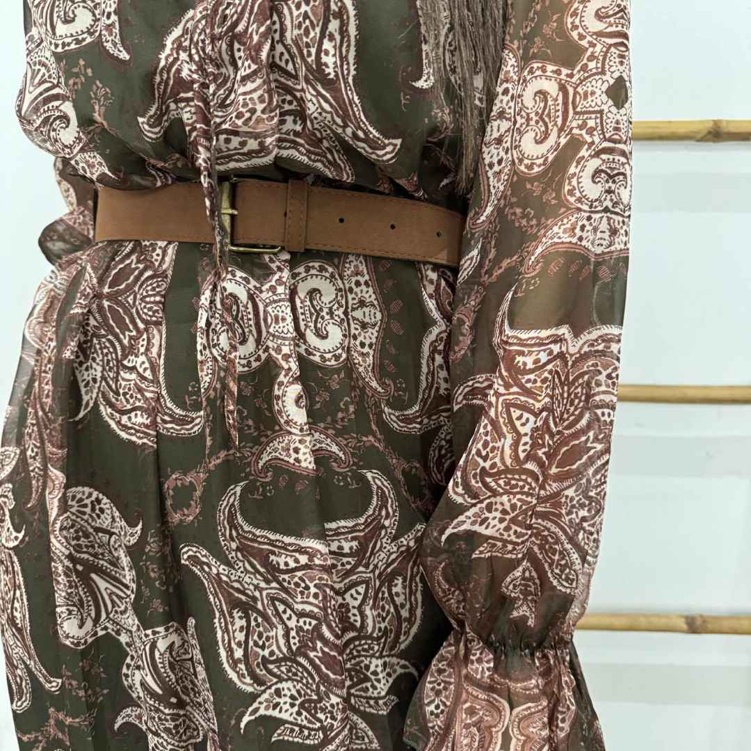 Αέρινο boho midi φόρεμα μουσελίνα σε χακί απόχρωση με εμπριμέ σχέδιο, διαθέτει ξεχωριστό μεσοφόρι και ζώνη suede σε ταμπά χρώμα. Ιδανικό για κομψές εμφανίσεις με bohemian διάθεση.