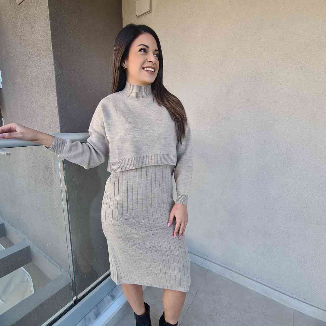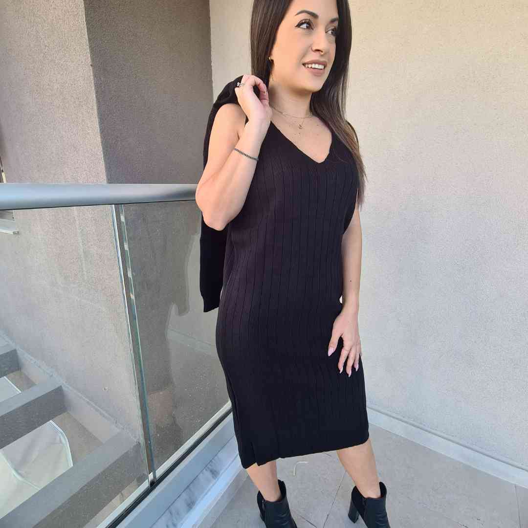 Αναδείξτε το στυλ σας με αυτό το πλεκτό midi φόρεμα τιράντα, διαθέσιμο σε διαχρονικό μαύρο και κομψό μπεζ χρώμα. Η ριπ ύφανση αγκαλιάζει τη σιλουέτα, προσφέροντας άνεση και εφαρμογή, ενώ το έξτρα crop top μακρυμάνικο μπλουζάκι προσθέτει ευελιξία, ιδανικό για layering.