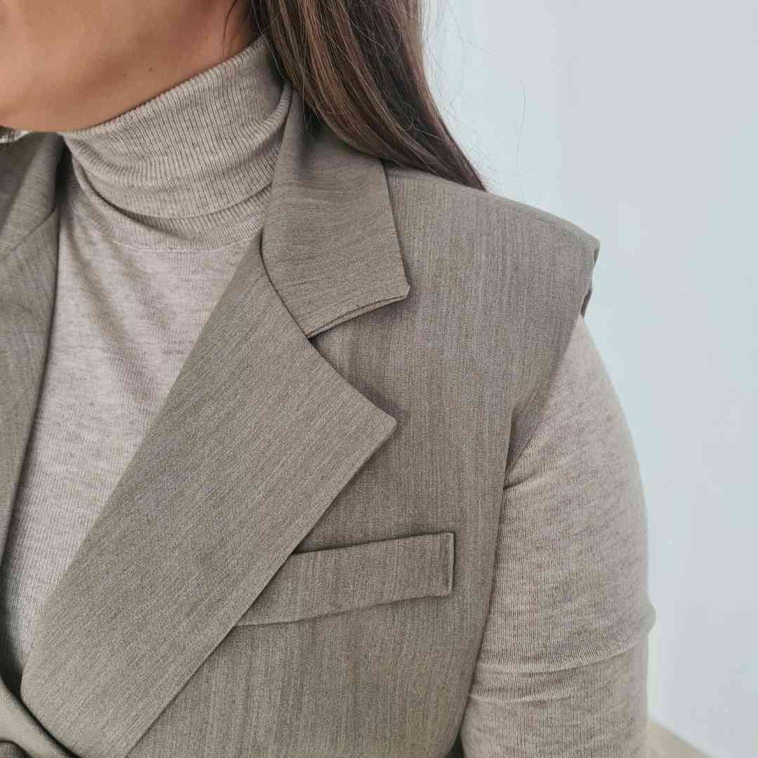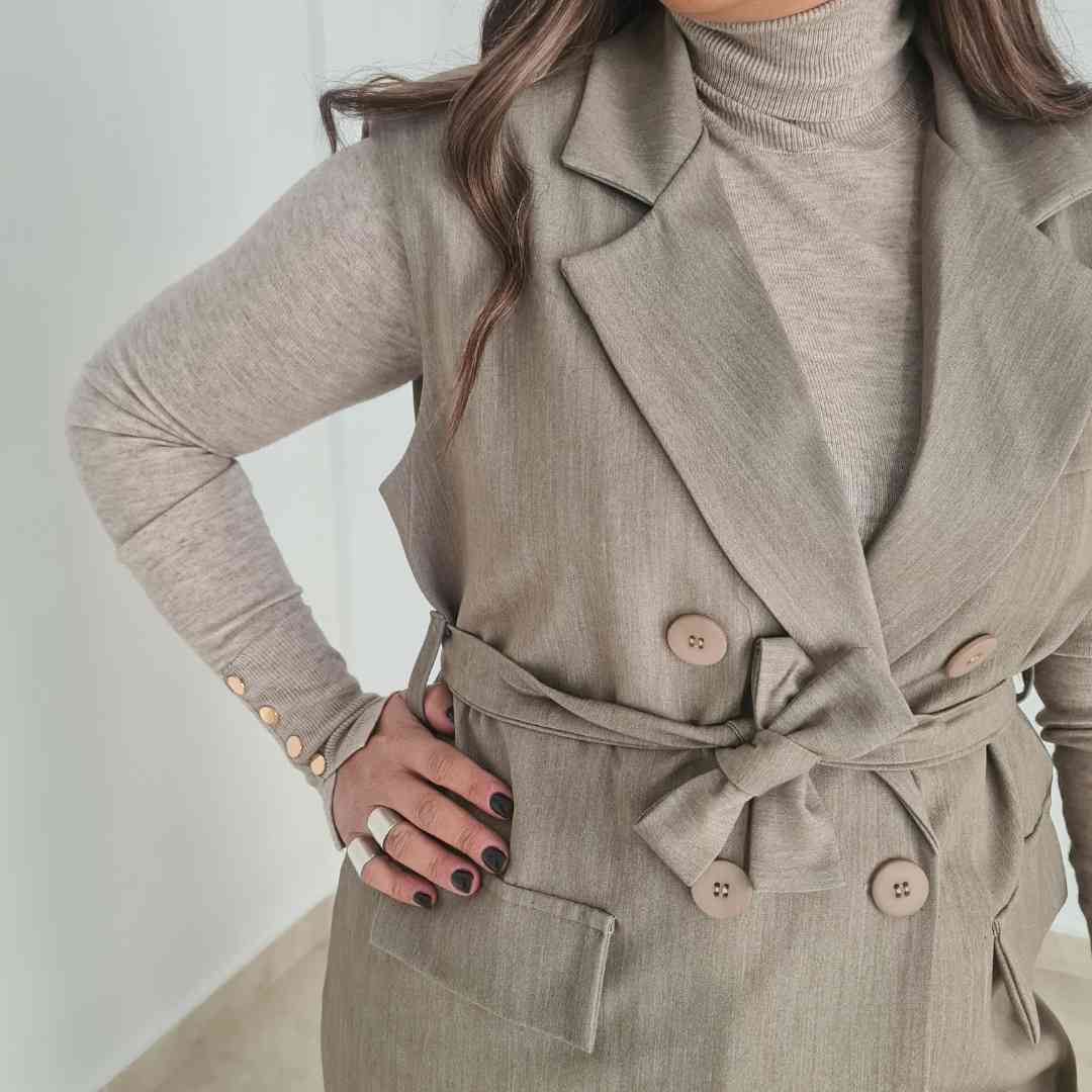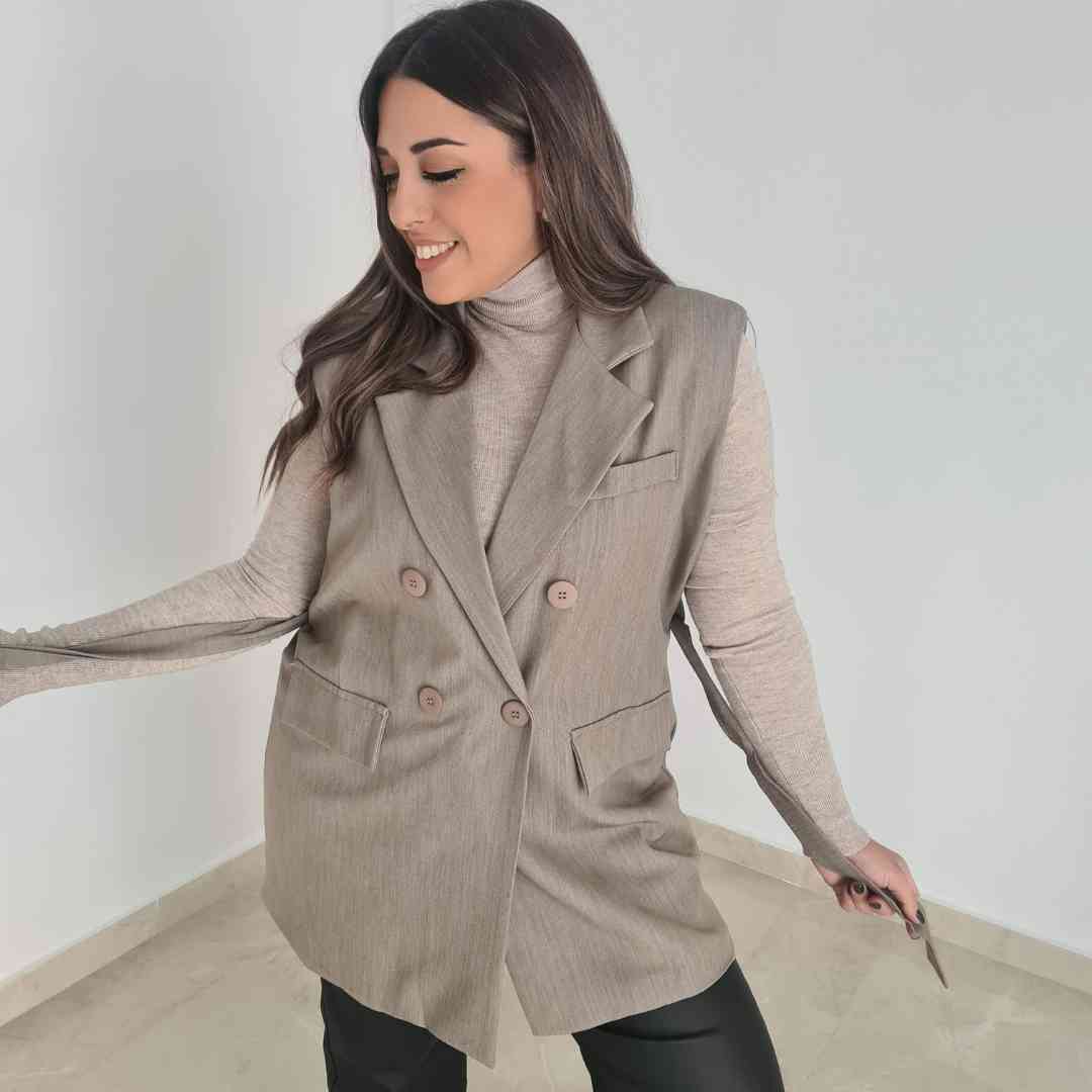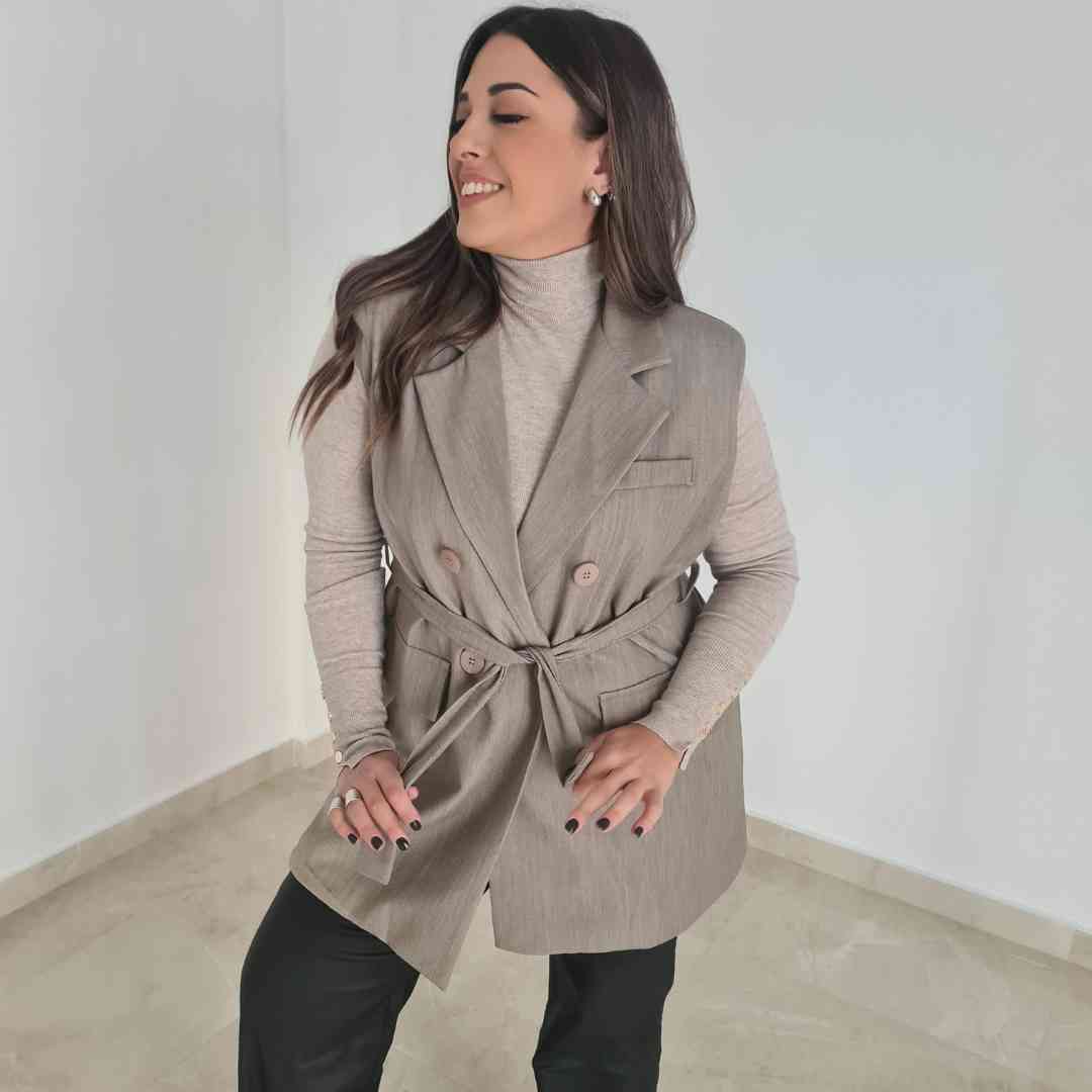 Γυναικείο υφασμάτινο φόρεμα σε γκρι και πούρου απόχρωση ή και αμάνικο γιλέκο. Διαθέτει ζώνη του ίδιου υφάσματος και διακοσμητικές τσέπες μπροστά. Τέσσερα κουμπιά εξωτερικά και ένα εσωτερικό για τέλεια εφαρμογή. Η λαιμόκοψη είναι V με γιακά και στους ώμους έχει βάτες. Διαθέτει επίσης μία διακοσμητική τσέπη στην καρδιά.